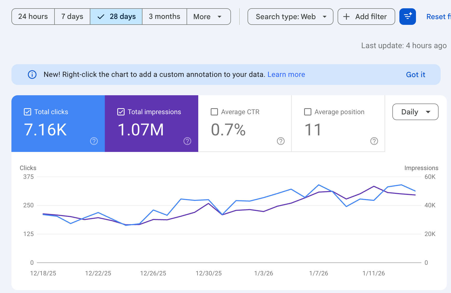 Over the last 28 days, Google showed my content 1.07M times: