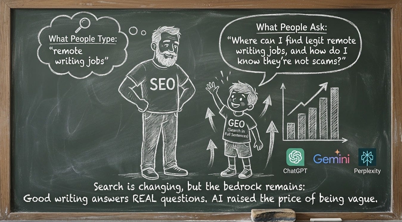 New version (GEO): “Where can I find legit remote writing jobs, and how do I know they’re not scams?”