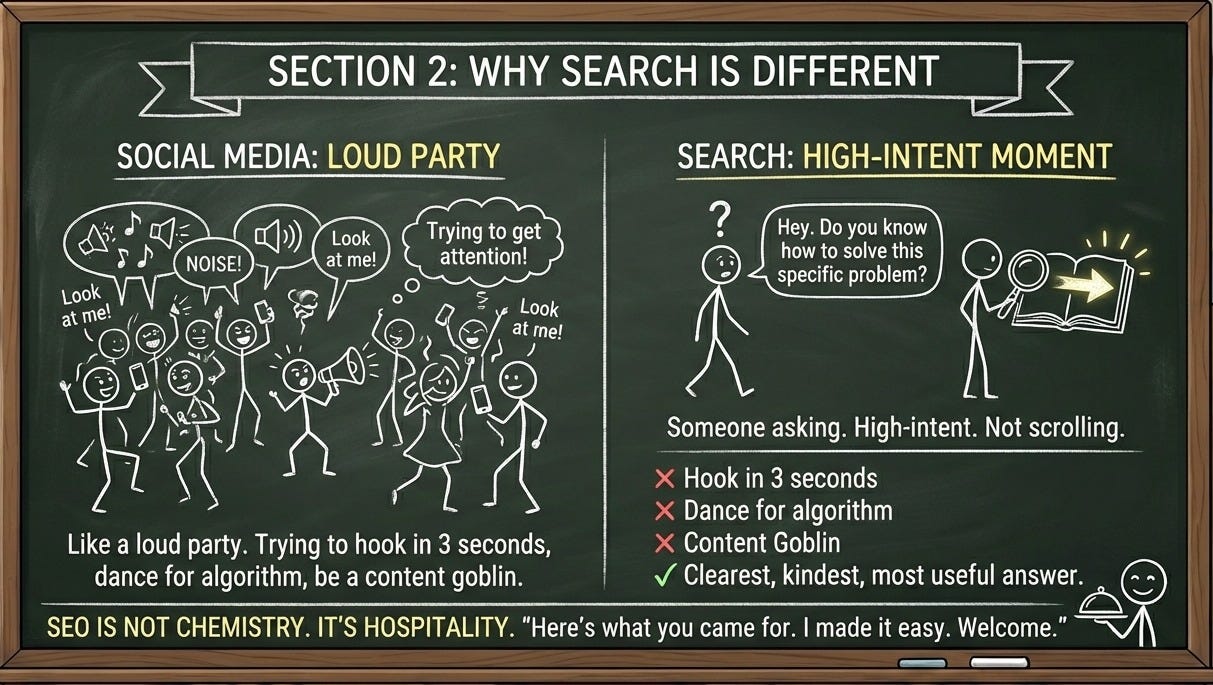 Social media is like trying to get someone’s attention at a loud party. Search is different. Search is someone walking up to you and saying: