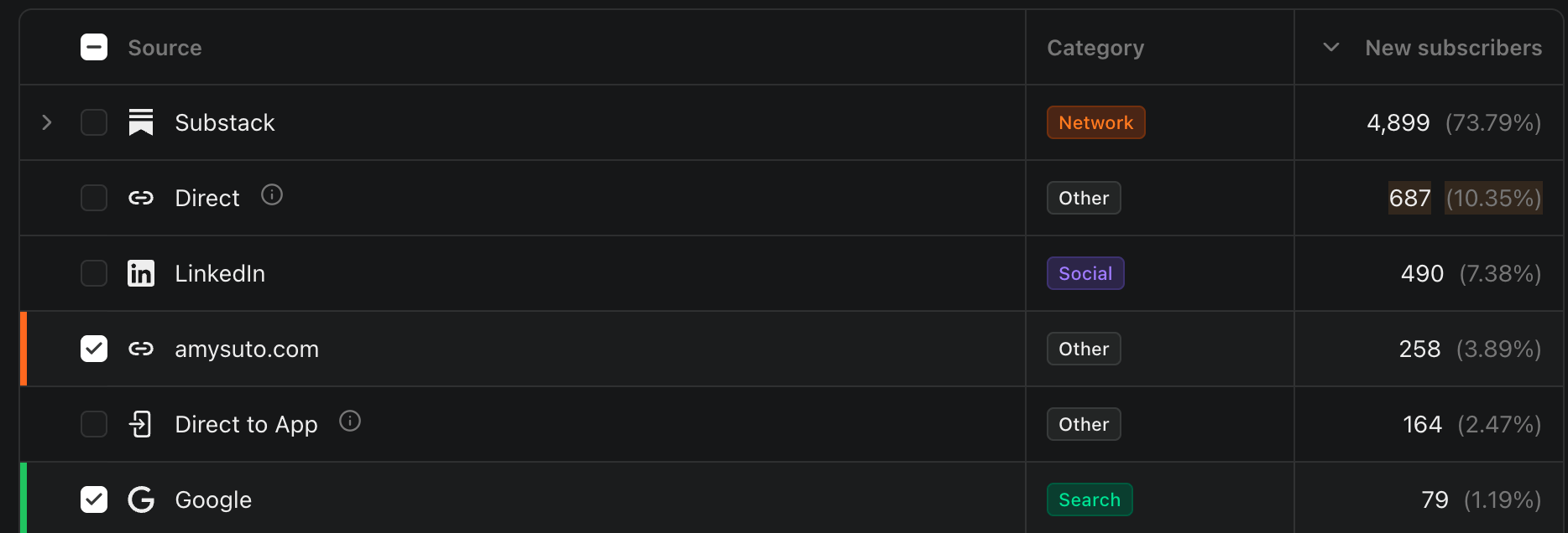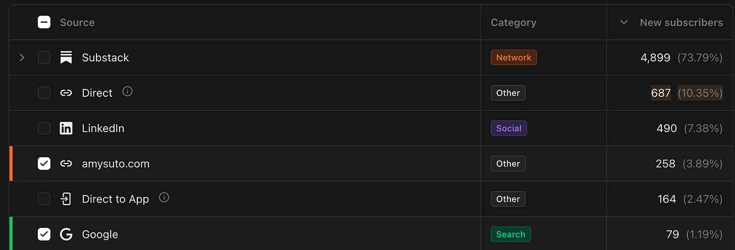 Here’s what my traffic sources looked like recently behind-the-scenes in my Substack growth dashboard: